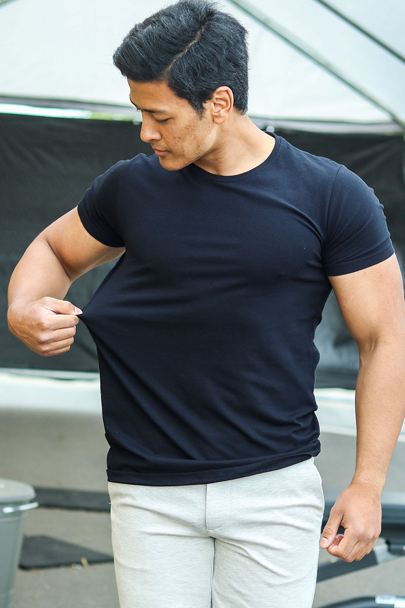 T-shirten kommer i en pakke med to styk, så du har en til træning og en til hverdagsbrug. De kommer med klassisk o-hals og ribkant. Muscle fit t-shirt har en tætsiddende pasform