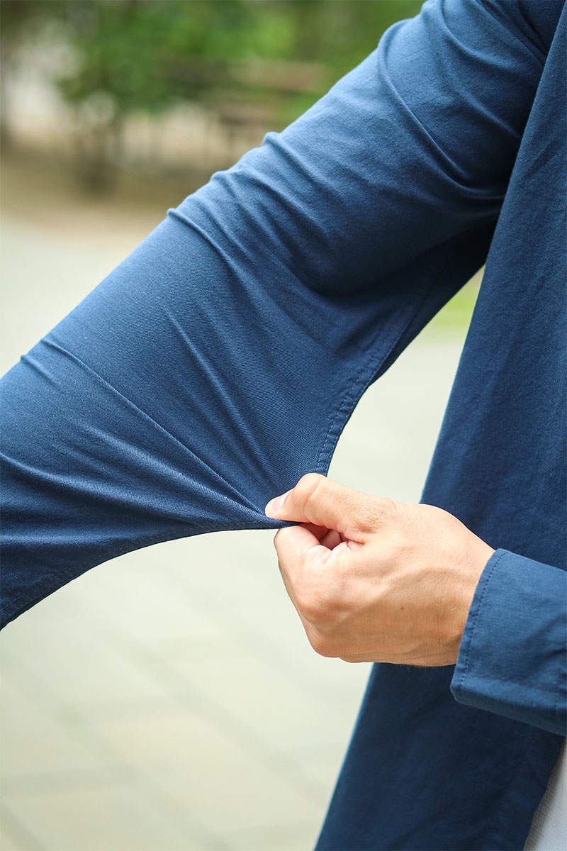 Modellen er 184 cm høj, vejer 84 kg, og bruger produktet i størrelse L