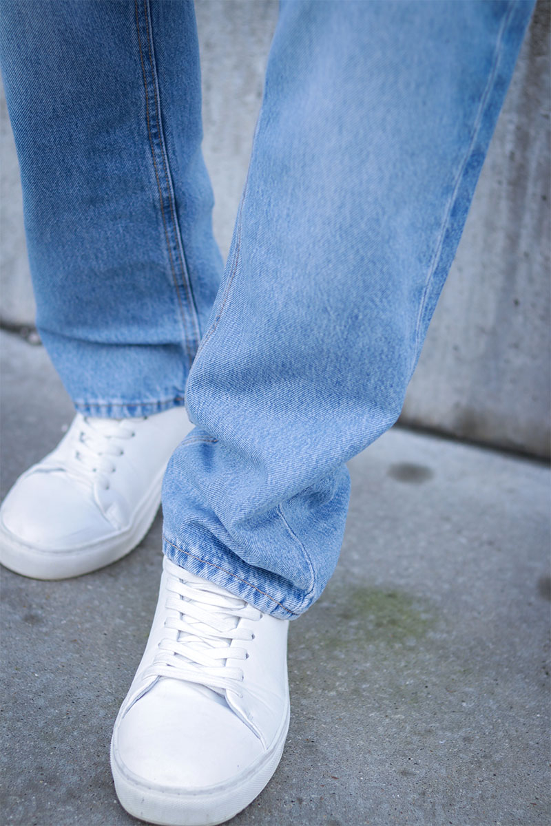 Modellen er 182 cm høj, vejer 80 kg, og bruger produktet i størrelse 32/32