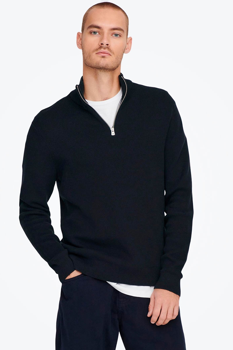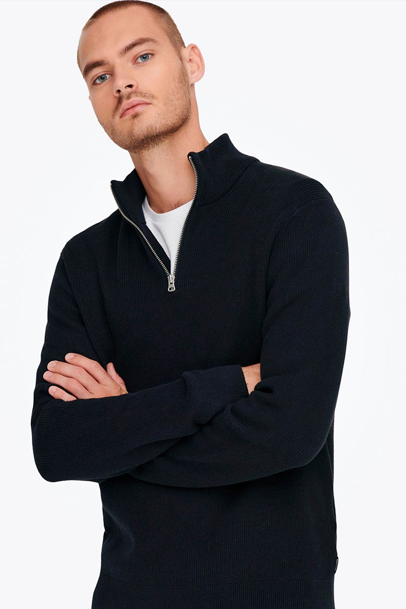 Tilbage til oversigten 2trendy > Tøj > Striktrøjer > ONLY & SONS PHIL COTTON HALF ZIP KNIT Dark Navy Leveringstid: 1-2 dage