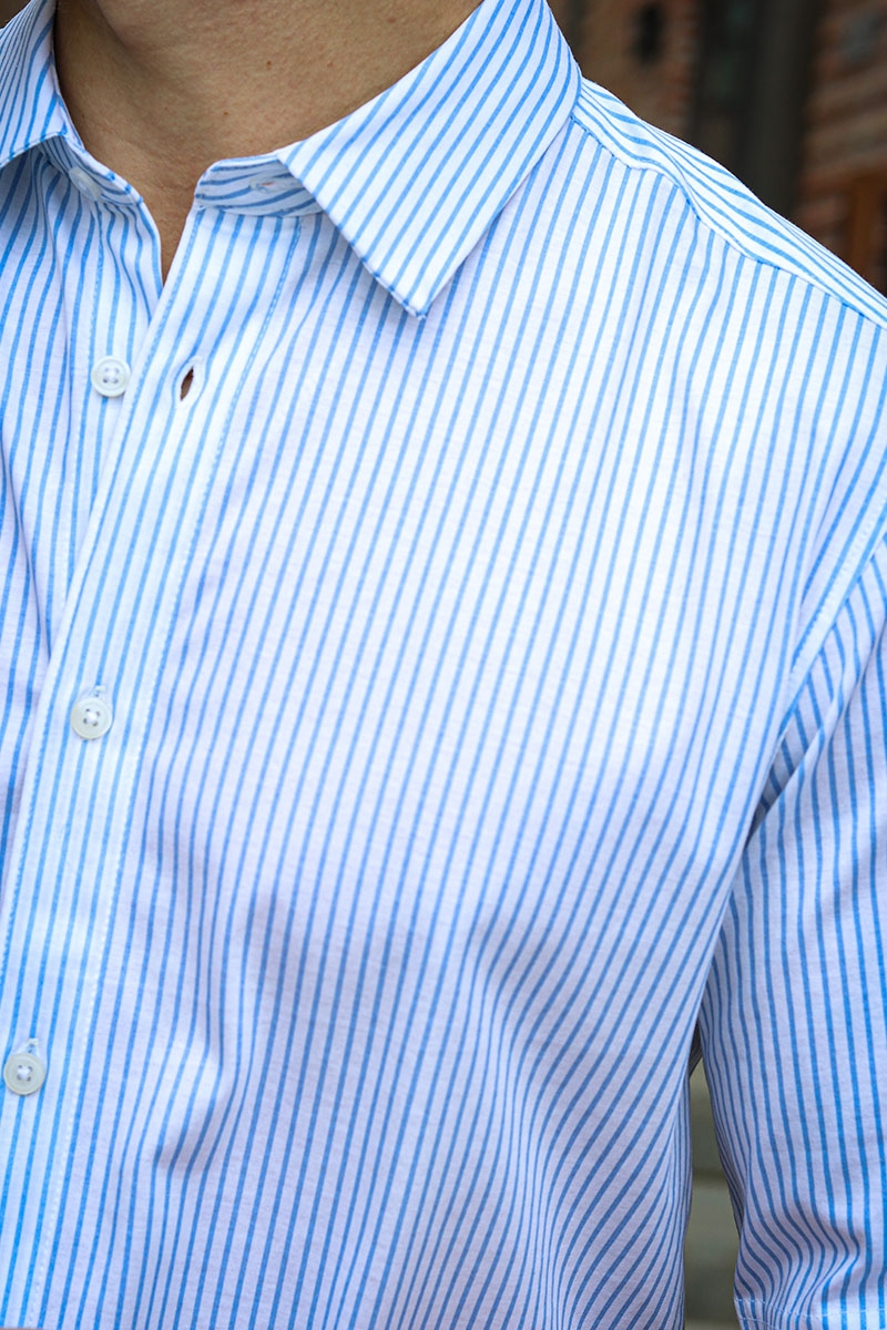 Cashmere Blue Stripe Comfort Shirt er alsidig og nem at style, hvilket gør den til en fantastisk tilføjelse til enhver garderobe. Det blå og hvide stribede mønster er klassisk og tidløst, hvilket gør det nemt at kombinere med en række forskellige bukser og sko. Dress den op med en blazer og habitbukser til en formel lejlighed, eller kombiner den med shorts og sandaler til et afslappet look.