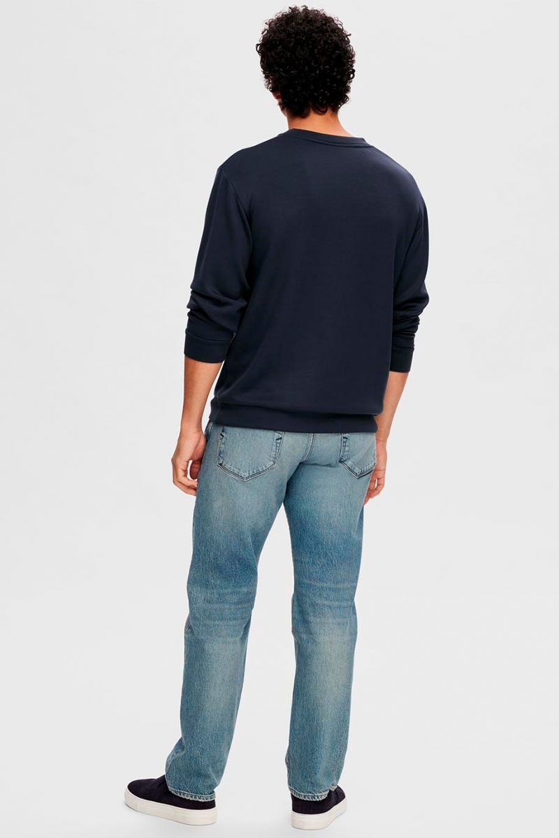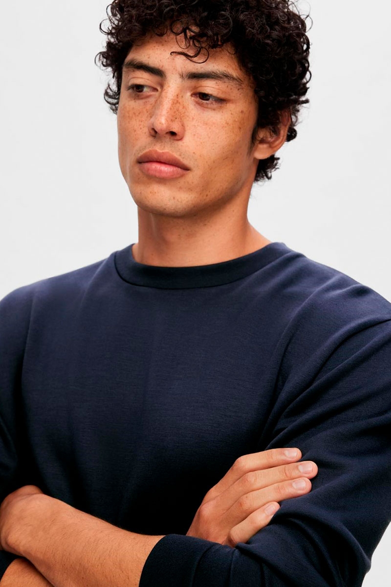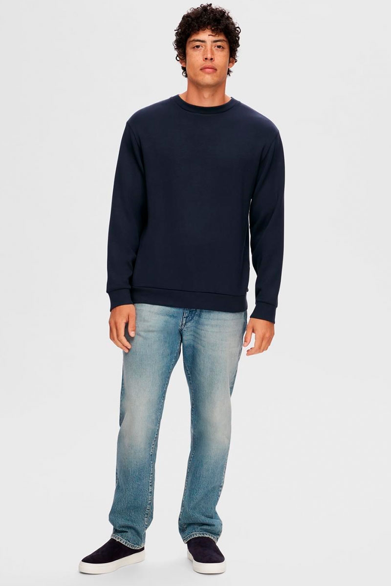 Selected Sweatshirt i farven Sky Captain (Navy). Denne SOFT SWEAT er produceret i et meget blødt og behageligt materiale. Den har en klassisk rund halsudskæring og et slankt design, hvilket gør denne sweatshirt perfekt til afslapning derhjemme eller til weekendens aktiviteter.