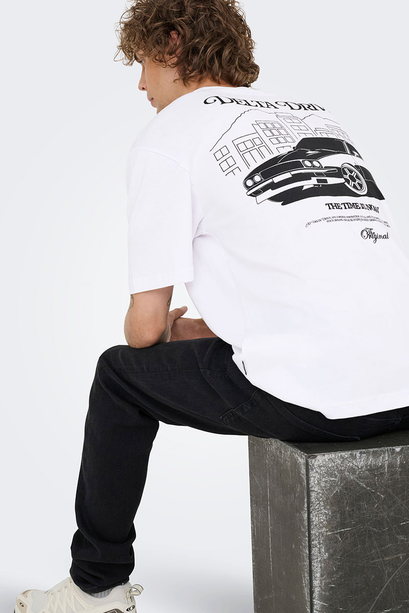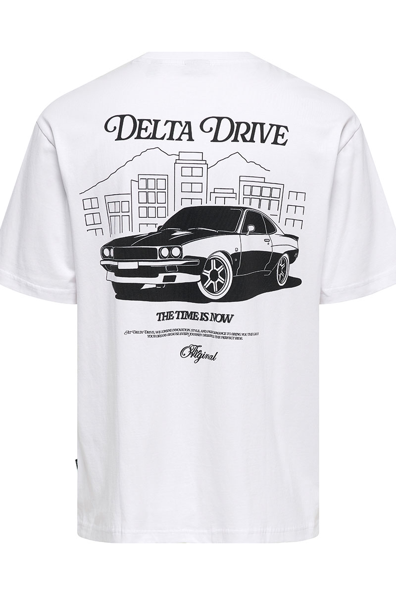 Tilbage til oversigten 2trendy > Tøj > T-shirts > Backprint T-shirts > ONLY & SONS Nathan Backprint Relaxed Fit Tee Bright White Delta Drive Leveringstid: 1-2 dage