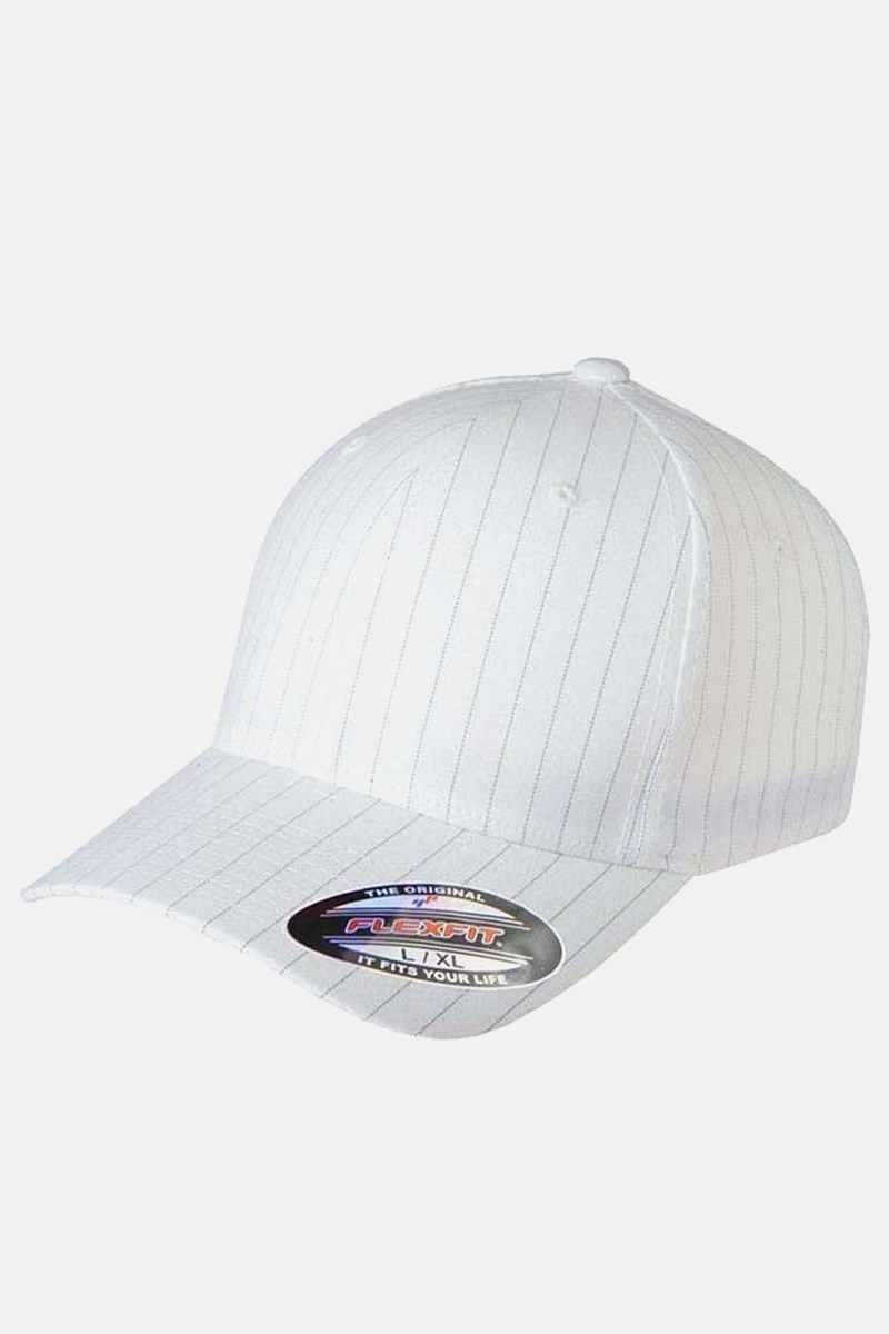 Flexfit Pinstripe Cap i hvid udgave med sorte pinstripes. Komfortabel kvalitet med stretch, hvilket sikrer en god pasform. Klassisk design med buet skygge, detalje knap på toppen, og seks lufthuller. Kvalitet: 97% Polyester, 3% Elastan