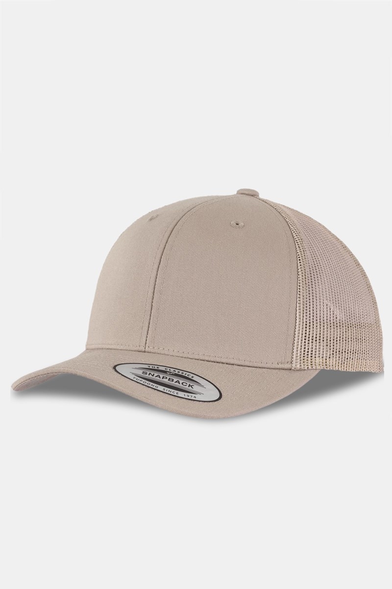 Flexfit trucker cap i khaki. Fortil på skyggen er der snapback klistermærke i sølv og sort. En klassisk trucker model, der justeres ved nakkespændet bagtil. Capen har en buet skygge