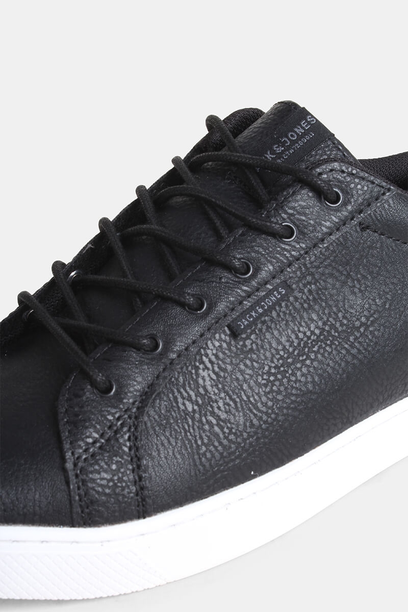 Sneakers fra Jack & Jones. Kommer i Sort PU læder med struktur og med hvid gummisål. Skoene kommer med runde snørrebånd. Tungen har en flap med Jack & Jones påsyet. Kvalitet: 100% polyuretan. Sål: 100% gummi.