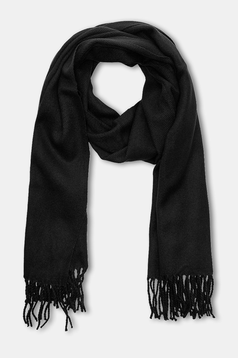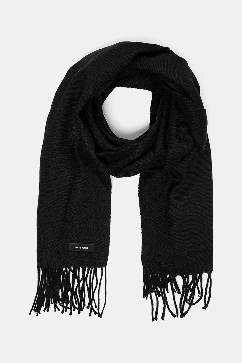 Jack & Jones sort halstørklæde i et blødt og behageligt polyester og akryl materiale, hvor polyestert er af genanvendeligt materiale. Detalje med et lille logolabel og frynser i enderne. B: 68cm. L: 1,80 cm. Kvalitet: 50% akryl, 50% recycled polyester.