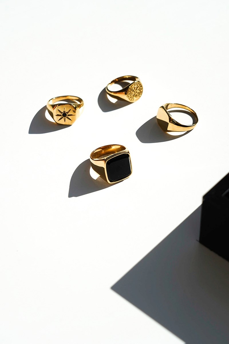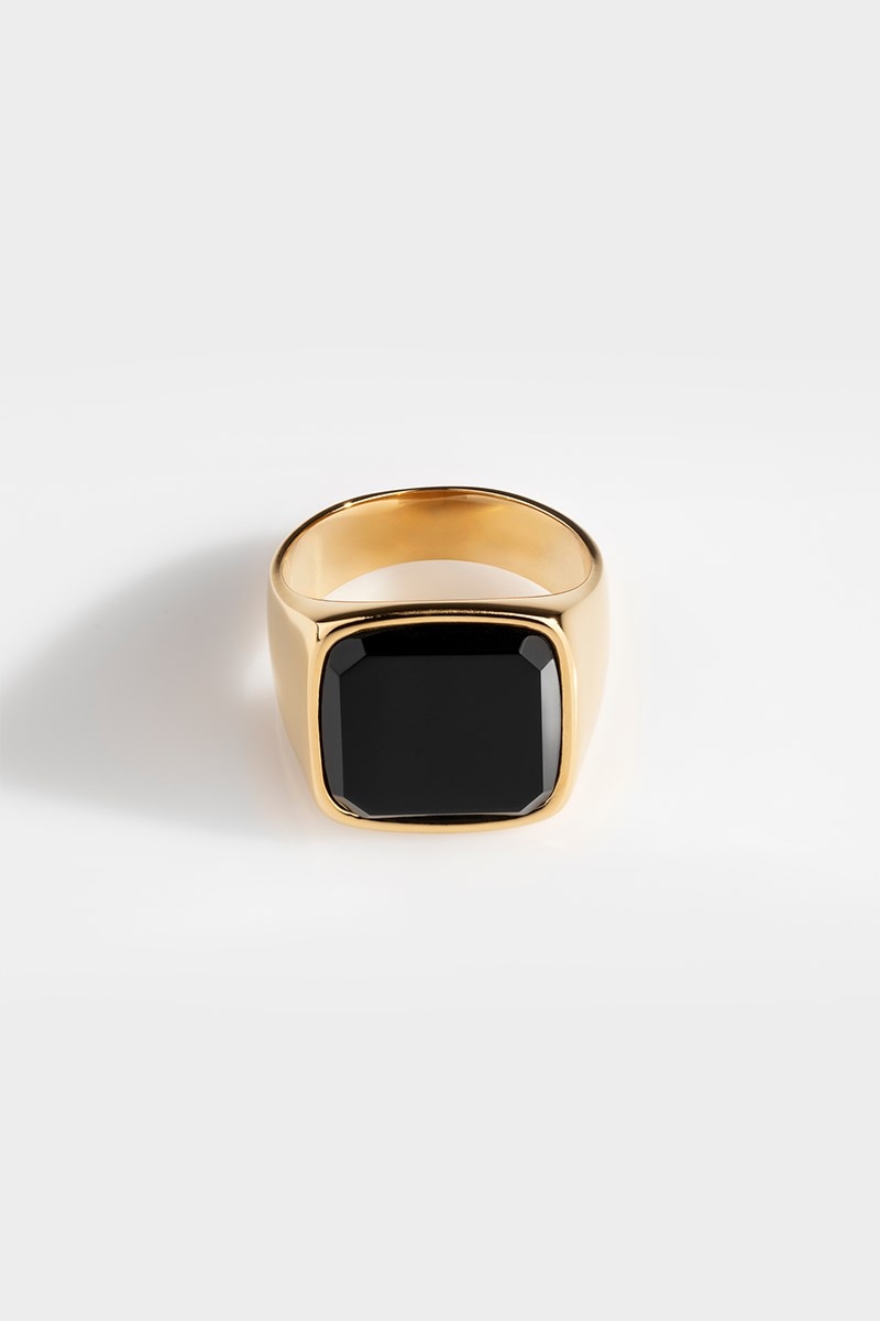 Northern Legacy oversized ring i stål med guld look. Denne model har en 18x18mm overflade. Ringen har en naturlig sort onyx sten. Ringen er lavet i 316L rustfrit stål og har Northern Legacy indgraveret invendigt. Til dig der foretrækker en mere robust look, der er både maskulin og eksklusiv.