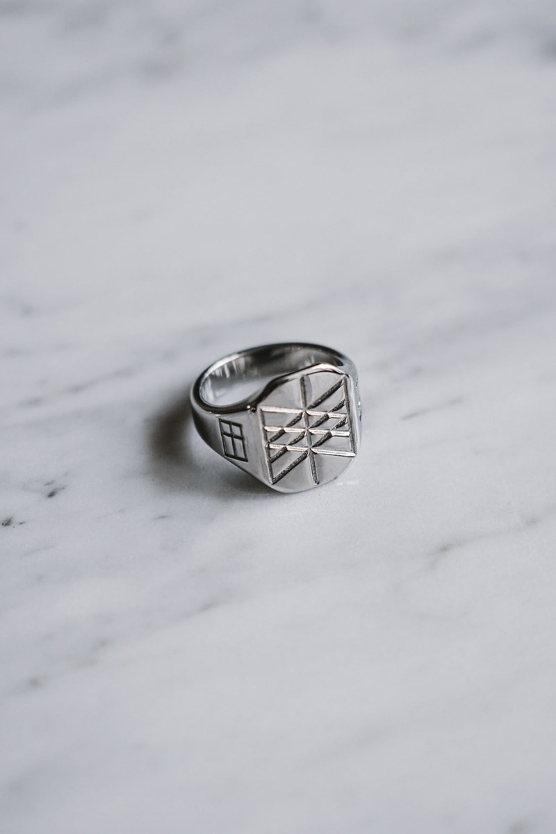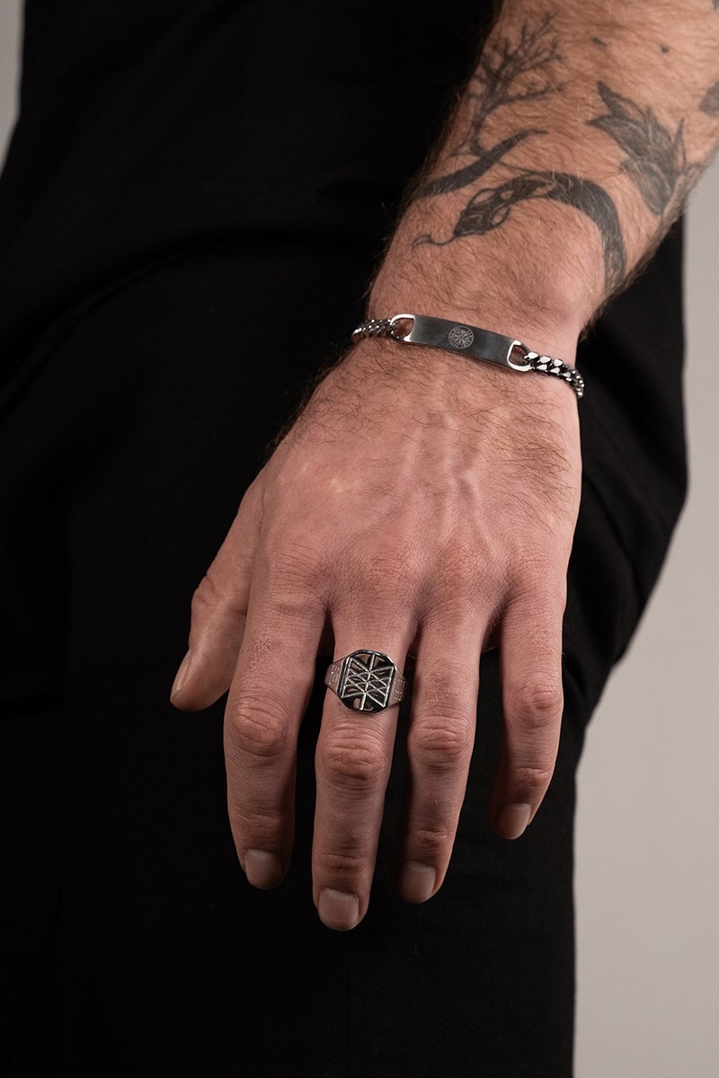 Northern Legacy sølvtonet ring med 13x18mm overflade, hvor vikinge symbolet "Web og Wyrd" er graveret. Det brede stykke af siderne er ligelede ledes graveret med flag. Ringen er lavet i 316L rustfrit stål og har Northern Legacy indgraveret invendigt. PVD belagt, med høj korrosionsbestandighed. 100% nikkelfri. Håndlavet